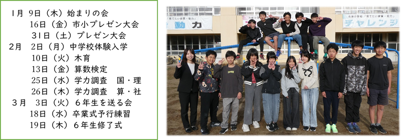 明けましておめでとうございます。2026年もよろしくお願いします。年末年始はどのように過ごされたでしょうか。私は家族とゆっくり過ごすことができました。さて、3月は卒業式があります。子どもたちもゴールが見えてそわそわしていると思いますが、やらないといけないこともまだまだ多いです。残された時間が少ないことを自覚し、時間を大切にしてほしいと思います。3月までのおおまかなスケジュールです。子どもたちと目標を決めて取り組んでいきたいと思います。保護者の皆様も御協力をよろしくお願いします。