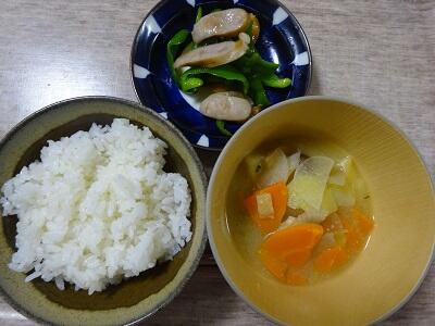 2日分のおみそ汁です。17日(火)は「大根、人参、じゃがいも、しめじ、小ネギ、油揚げ」、18日(水)は、「人参、玉ねぎ、白菜、さつまいも、小ネギ、油揚げ」でした。