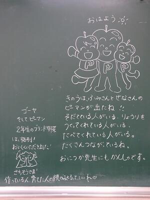 さて、今日も2年生が育てた野菜「ピーマン」が、給食に登場しました!鮮やかな緑色のツヤツヤしたピーマンが、給食センターに届けられました。セルフドッグの野菜ソテーに入れて出しました。みんな、ウインナーと一緒に野菜もしっかり食べていました。そして、9/1(金)の2年生教室の黒板には、食でつながる嬉しい気持ちが書いてありました。