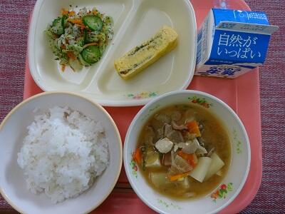 今日は、一汁二菜の「和食給食」です。汁物は、豚肉や豆腐、野菜をたっぷり入れた『豚汁』です。少しずつ、秋の風を感じますが、まだまだ昼間は暑く、汗をかきますね。熱中症予防のためにも、しっかり汁物を食べましょう!