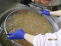給食ののっぺい汁は、大根やにんじんは、いちょう切りにして作っています。昆布とかつお節で取った出汁の中で、材料を入れて煮ていきます。出汁のうま味と、食材のうま味が合わさって、体にしみわたる美味しいのっぺい汁になりました。