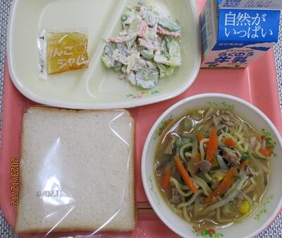 食パン りんごジャム 牛乳 野菜たっぷりみそラーメン れんこんサラダ