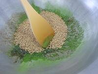 今日は、新茶の季節に合わせて、抹茶味の豆を作りました。新茶は、香りがしっかりあり、ほんのりと甘みがあるのが特徴です。また、渋みが少なく、うま味成分が多く含まれているため、甘く感じるそうです。