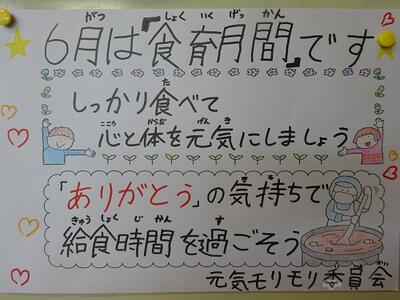 さて、今日から6月になりました。6月の給食の目標は、『歯と口の健康を考えて、噛むことを意識して食べよう!』です。噛むことを意識できるように、食材の組み合わせを工夫していきます。