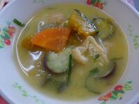 夏野菜のみそ汁は、かぼちゃとなすを入れて作りました。今日のかぼちゃは、実が黄色でほくほくしていました。かぼちゃの甘みとかくし味の豆乳で、まろやかなおみそ汁になりました。