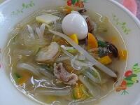 主菜のタイピーエン(太平燕)は、熊本県を代表する郷土料理の一つですね。給食のタイピーエンは、豚肉、いか、えび、うずらの卵、野菜、きくらげ、干し椎茸、春雨を入れて作ります。材料を順番に炒めて、煮ていきます。味つけは、塩、こしょう、うすくちしょうゆ、料理酒、赤酒です。たくさんの材料からのうま味が出て、とってもおいしい味になりました。