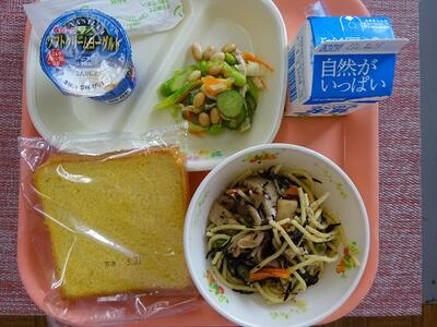 米粉入りかぼちゃパン 牛乳 和風ひじきパスタ ビーンズサラダ ヨーグルト