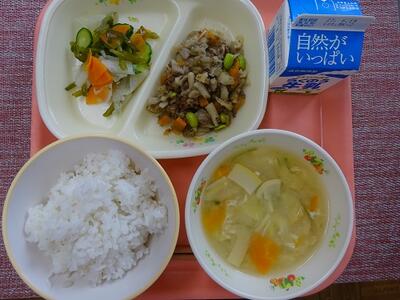セルフシャキシャキそぼろ丼 牛乳 たけのこの味噌汁 野菜の甘酢和え