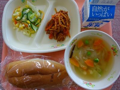 コッペパン(カット) 牛乳 野菜たっぷりスープ 洋風きんぴら チーズサラダ