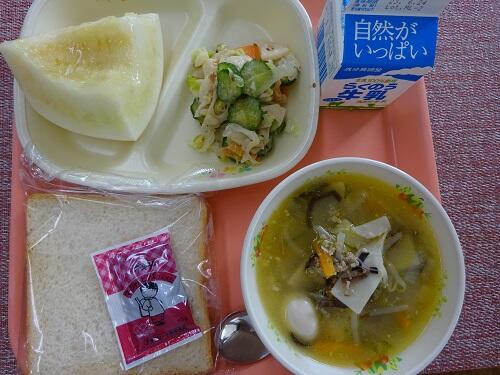 食パン マーシャルビーンズ 牛乳 ワンタンスープ れんこんサラダ ホームランメロン