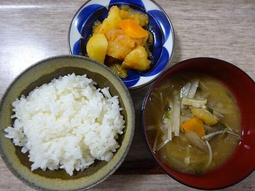 おみそ汁は、たけのこの水煮、じゃがいも、玉ねぎ、人参、油揚げ、ねぎを入れて作りました。たけのこの食感が、とても良かったです。今日は肌寒い日だったので、おみそ汁の温かさが嬉しかったです。