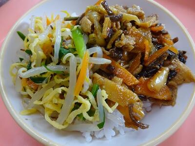 今日の給食では、韓国料理で有名な「キムチ」を、豚肉や山菜、きくらげを入れて炒めました。少しピリッと辛いキムチを使っているので、野菜のナムルと一緒に、ごはんにのせて、よく混ぜて、食べてください。