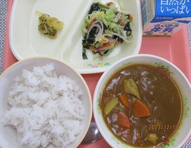 冬休みまで、一週間となりました。週明け月曜日。少しでも元気にスタートできるように、人気のカレーライスにしました。じゃがいも、人参、玉ねぎの定番カレーは、とてもおいしかったです!いつもより早めに食べ終わる子どもたちが、多かったです。