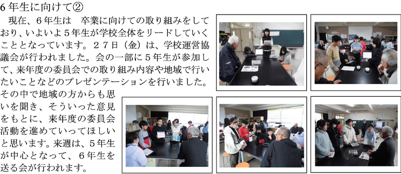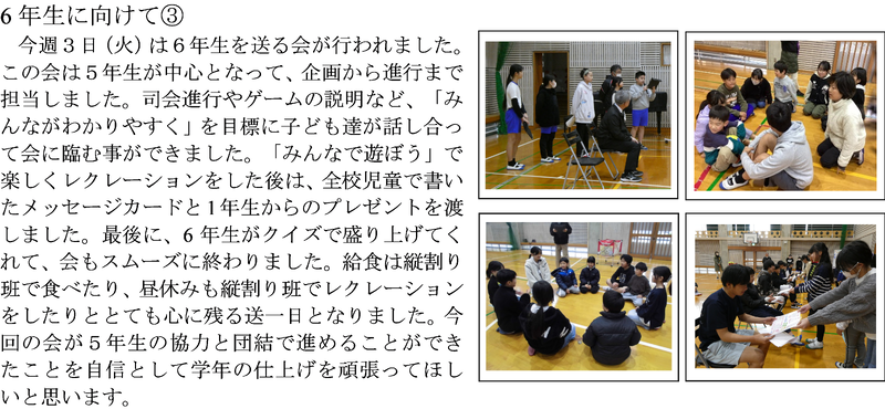 12日(木)はクラブ活動の最終回がありました。それぞれのクラブで反省をしたあとに最後の活動をしました。中学校ではクラブ活動がないので最後の活動を楽しんでいました。委員会活動は19日に今年度のメンバーでの最後の活動・引き継ぎでした。クラブ活動でも委員会活動でも一人一人がリーダーシップを発揮し、自分たちで考え行動することができていました。20日は新年度のメンバーで集まりました。6年生はアドバイザーという立場で参加しました。これまで行ってきたことをしっかり新5,6年生に引き継いでくれたことと思います。委員会活動の時間だけでなく、休み時間も使って活動をしてくれました。この経験を中学校で生かしてほしいです。6年生のみなさんお疲れ様でした。