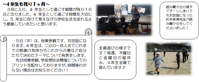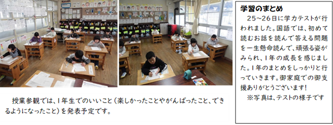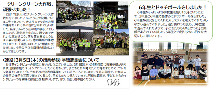 3月5日(木)は授業参観、学級懇談会お世話になります。今年度、6年間最後の授業参観は国語の授業をします。「今、私は、ぼくは」とい単元で将来の夢についてのプレゼンを行います。1人1 分半〜2分半を予定しています。最後の10分程度は卒業プロジェクトの中で子ども達が企画したことを行います。内容は当日を楽しみにされていてください。順番、タイムスケジュールは後日子ども達に持たせます。