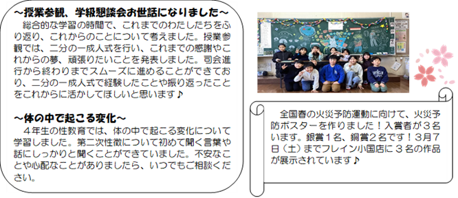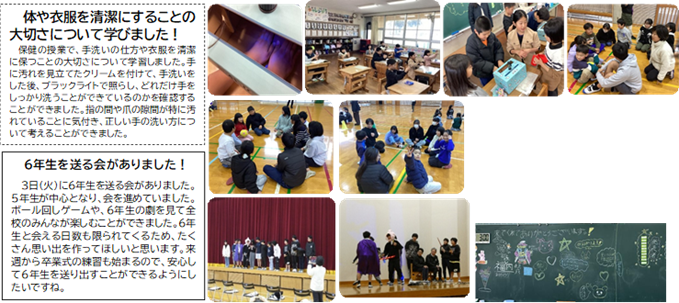 授業がある週も残り2週となり、学校に来る日は9日(月)で残り10日となりました。3月になってからは毎日席替えを行ったり、卒業制作を作ったり、6年生を送る会があったりと卒業生らしい生活を送っています。残りの日数で学習のまとめをしてまいります。