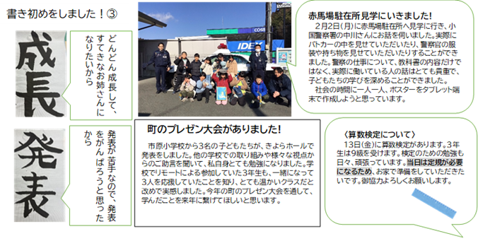 1月31日にプレゼンテーション大会が行われました。代表児童は、何度もリハーサルをして内容を工夫していきながら緊張はしていましたが堂々と発表していました。結果は「町議会議員賞」を獲得し、ほっとした表情がみられました。ほかの学校のお子さんも発表内容、態度もすばらしかったです。来年も子どもたちの雄姿がみられることを楽しみにしています。