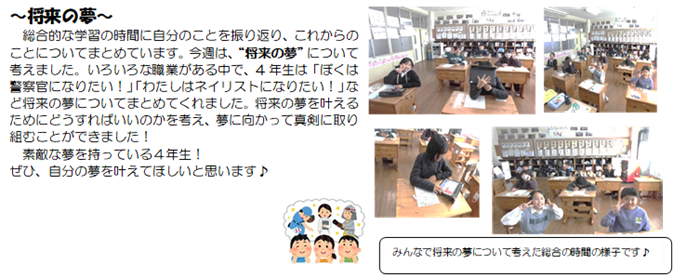 2年生のプレゼン大会から1ヶ月経ちました。昨年の2年生のプレゼンを見て、「みんなが笑顔になるために何ができるかな。」をテーマに家や学校の中で「こんな風にしたらみんなも助かって笑顔になるんじゃないかな。」と、一人一人自分ができることを考え、タブレットのロイロノートに自分の考えや、やってみたことの感想、写真、動画をまとめていきました。先月行われた町のプレゼン大会では、2年生代表児童が発表まで、毎日のように放課後きよらホールで練習し、教育委員会の先生方からアドバイスをいただいていましたし、発表内容を何度も考え練習しました。本番は、多くの人の前で、捨てられるはずのダンボールをおばあちゃんとバッジにして、家族や友だちを笑顔にしたことを堂々とはきはきとした態度で立派に発表することができました。他の子どもたちは、「上手で、すごかったよ。」「かっこよかったよ。」「はきはきしていたよ。」と、友だちの頑張りをしっかりたたえていました。日記にも「今度は、だいひょうにえらばれて、きよらホールではっぴょうしたいです。」と、書いている子が何人もいました。(^o^)来年が、楽しみですね。 そして、今、2年生は、自分たちが考えた「みんなが笑顔になるために」を実際に行動に起こそうとしています!名付けて「2年生のマルシェにきませんか」です。子どもたちは、チラシやポスター作り、校内放送するための練習などをはりきっています。また、マルシェに飾るためのダンボールで作った☆星やダンボールやペレットが入っていた袋を使って作ったゴミ箱、材料集めのための箱、看板なども子どもたちが考えた物もこのマルシェ盛り上げる物になり、みんなで力を合わせて休み時間に進めてきました。きっと、みんなが笑顔になるマルシェとなるでしょう。楽しみです!