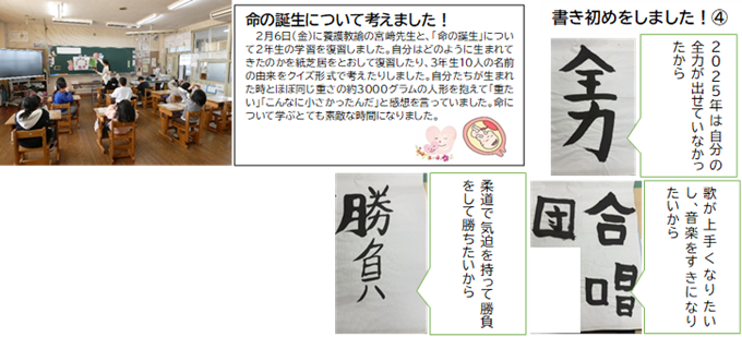 1月が終わりましたね。実は、1月は給食週間があり、学校では、委員会の子たちが給食集会を開き、全校のみんなに、バランス良く食べることや風邪をひかないように残さず食べること、給食に関わる人のことに対して、感謝の思いを持つことを伝えてくれました。ほかにも、調理員さんの声を届けてくれました。調理員さんからは「ご飯やおかずが残っていないと、とってもうれしいです。」「食べた後の食器や食缶は、みなさんの気持ちがつたわります。」など日頃、聞けない思いを知ることができました。調理をしている写真や動画を見せながら、栄養教諭の鬼塚先生が「みんながおなかを壊さないように、まな板やザルを洗っています。みんなも健康観察をしているように、お肉や野菜、調理したフライもの温度ではかっています。」「つめブラシを使って1日20~50回手を洗っています。」と話して下さいました。このような話は何度も聞きたいし、聞かなくてはならない話だと思いました。「いただきます。」「ごちそうさまでした。」を言うときに、食に関わった人たちの顔を思いうかべてこれから言うように大事に言っていきたいと思います。