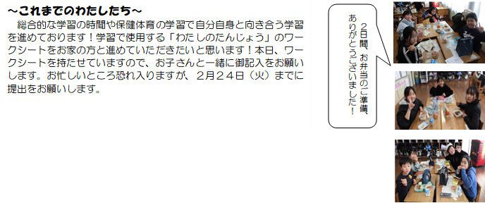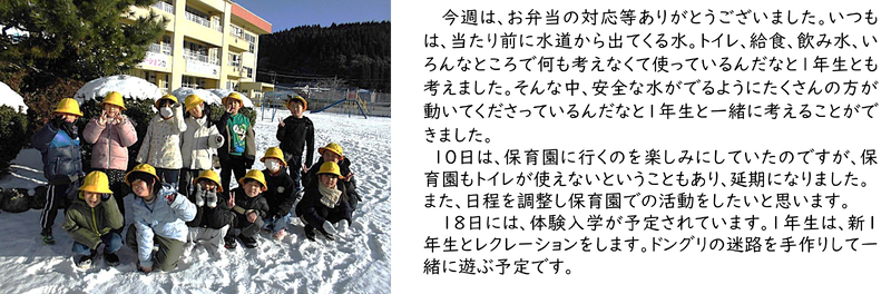 先日から水の使用に関して各御家庭でも苦労されたことと思います。その中でお弁当作りや水筒を持たせていただくなどお世話になりました。久しぶりのお弁当に子どもたちもわくわくしている様子でした。いつものように水が使えなくなり、当たり前に感じていた水のありがたさを実感する1週間となりました。