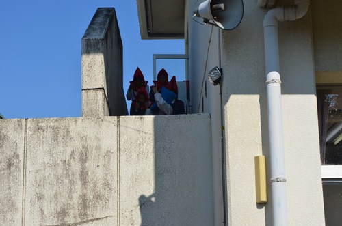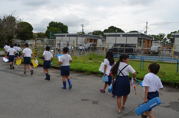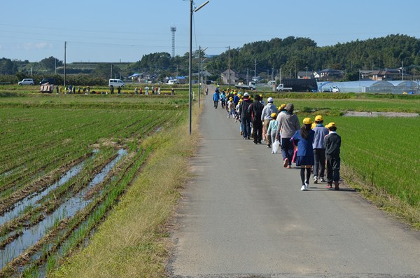 仮設住宅・・・西門・・・を後に、稲刈りをする田んぼへ。