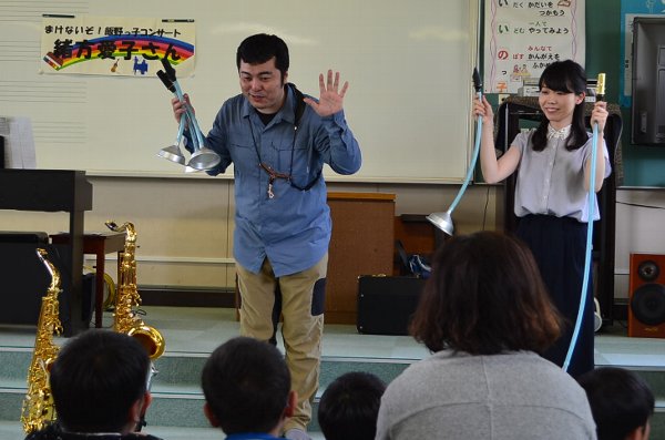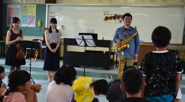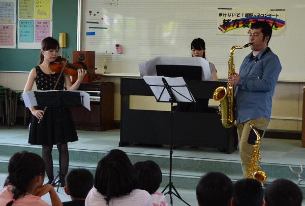 5月2日(月)Trio Colore(トリオ コローレ)コンサート 投稿日時 : 2016/05/02 学校サイト管理者 本日の「青空教室」に特別ゲストが出演されました。緒方 愛子( ヴァイオリン) 西口 新一郎(サクソフォン) 山本 亜矢子(ピアノ)の3人の方によるコンサートです。音楽室にて14:00~14:45の45分間、美しい音色、音楽に包まれ、心を解きほぐされました。アンコール曲の「ふるさと」は心にしみました。最後の感想発表です。