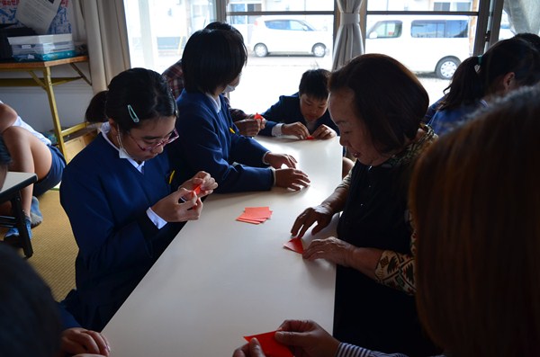 平和集会で捧げる千羽鶴を、仮設住宅の方と一緒に折ろうということで、「みんなの家」を訪問しました。