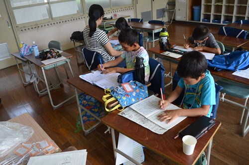 8月22日(月) 2学期始業式 投稿日時 : 2016/08/22 学校サイト管理者 7月28日から始まった、短い夏休み、今日で終わり。ちょっぴり名残惜しようなぁ・・・・・・・宿題もみんな終わったのかなあ?短いだけに心配です。体調不良等で、欠席は若干多めの2学期スタート。早く元気になあれ!地震のために、熊本市内から区域外就学していた5年生が、市内の学校に帰っていきました。2学期から全校児童120人になりました。レジェンドゴルフのチャリティからいただく電子黒板について、説明しています。新聞その大きさが、今学校にある電子黒板の大きさです。二回りは大きいです。夏休みに頑張ることとして、「命を大切に」「あいさつ」それと・・・・・・子どもたちの自己申告(挙手)でしたが、お手伝い頑張った子どもたちたくさんいたようです。2学期、まずは9月25日の2動会です。夏休みの出来事と、2学期の目標の発表です。福井県と沖縄県から来られているボランティアの先生方です。今週1週間お世話になります。昼休み、太鼓の練習です。運動会で披露します。