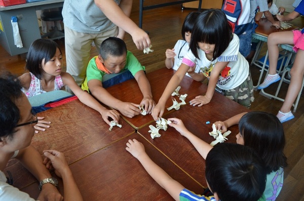 8月10日(水)「イルカの骨」教室 by学びーば 投稿日時 : 2016/08/10 学校サイト管理者 今日の「学びーば」はイルカの骨について勉強です。専門の先生は鹿児島からいらっしゃいました。遠路ありがとうございます。イルカ以外のほ乳類(イルカもほ乳類ですね・・)の骨もあります・骨を順番に並べるのはなかなか難しい~大きさや形が違うのですが・・・・微妙・・・・です。