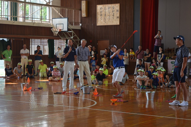 8月21日(日)スナッグゴルフ大会 投稿日時 : 2016/08/21 学校サイト管理者 スナッグゴルフ?あまり聞き慣れない言葉ですね。年齢を問わず生涯スポーツで楽しめる簡易版ゴルフです。名だたるプロゴルファーや益城地元のプロがコーチになって教えてくれるというという贅沢な内容。サイン会も開かれました。スナッグゴルフが終わった後は、音楽室に移動して電子黒板の贈呈式です。「ザ・レジェンド・チャリティプロアマトーナメント」での収益から益城町小中学校7校に電子黒板を寄贈していただきました。「地震のあと学校が休みになり、僕は家を手伝いました。大変でした。そんなときに、親戚が手伝ってくれました。とても助かりました。飯野小学校にもたくさんの人が来てくれました。僕たちに勉強を教えてくれたり、楽しい活動をしてくださいました。とても感謝しています。僕も、いつか誰かを救えるような人になりたいと思っています。そのためにも勉強やスポーツを頑張りたいです。授業中にも電子黒板があると、楽しくてやる気になります。そして分かりやすいです。だから、電子黒板を使った授業が今から楽しみです。今日は本当にありがとうございました。」「世界の青木」さんと2ショット!!
