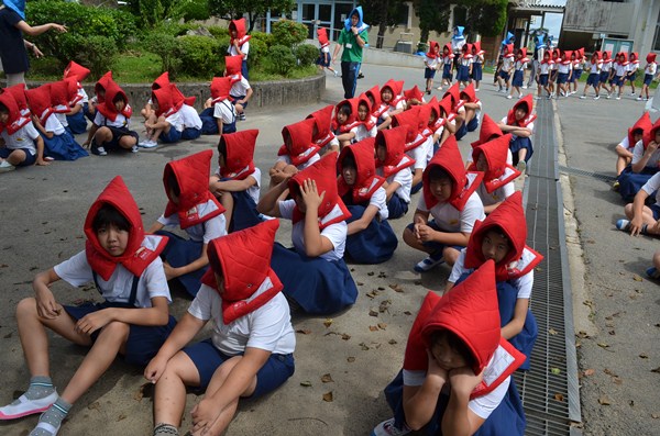今回は、セーブザチルドレンさんから支援していただいた防災頭巾をかぶっての、避難訓練になります。
