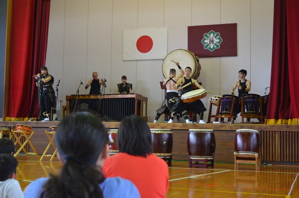 6月22日(水)和太鼓 松村組 復興支援太鼓 投稿日時 : 2016/06/22 学校サイト管理者 阪神淡路大震災後、復興をアピールするために創立されたという「和太鼓松村組」が、本校に登場。子どもたちがたたく和太鼓とはまたひと味違う、大人による力強い迫力ある太鼓の演奏でした。体育館全体が振動し、床がびりびりとふるえます。耳で聞くのではなく、体全体で音圧を感じる和太鼓の演奏でした。音楽クラブによる「共演」もありました。