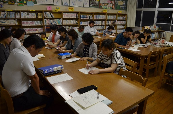 お隣の2年生教室では、担任の全体指導と平行して、佐賀県から来ていただいている復興加配教員の先生が、夏休みの宿題について個別の相談中でした。