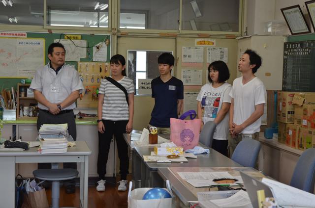 8月1日(月)「学びーば」 始まる!! 投稿日時 : 2016/08/01 学校サイト管理者 神奈川県の鶴見大学の学生を中心に(先生も来られています)ボランティアの大学生が、子どもたちの支援に入っていただいています。学習支援に、運動に、リクレーションに9:00から14:45まで、お世話になります。自分の学生時代の時に・・・・と思わず、我が身を振り返ってしまいます。今日は報道の方がたくさん入っていました。子どもたちは、マスコミ慣れをしてきているようです。受け答えも、それなりに上手になってきているような気がします。初めに、職員室に挨拶に来られました。年齢が近いから? あっという間にお友だち!子どもたちの夏休みが、有意義でありますように!!「つながり」を感じてくれたらうれしいです。