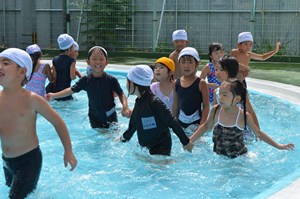 8月25日(木) 1年生保育園児とプールに 投稿日時 : 2016/08/25 学校サイト管理者 保小連携の一環です。第二保育園の年長さん18人が、1年生教室に登場。まずは教室で、ペア作り。久しぶりに出会った子どもたちもいたみたいで、盛り上がりました。司会の子どもたち、すごく頑張っていました。仮設住宅の横を通って、プールへ移動。ペアを作って一緒に仲良くプールで水遊びを楽しみました。