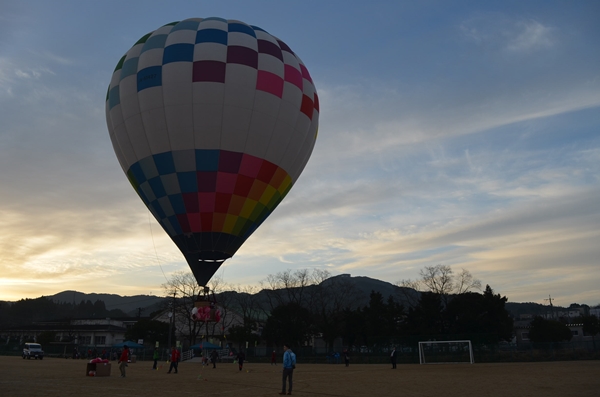 3月3日(土) 気球プロジェクト バージョンアップ 投稿日時 : 2018/03/03 学校サイト管理者 朝5時30分。まだ真っ暗な中で作業が始まりました。そうこうしているうちに、一組目の親子が。さむい!!観客もいて、気合いも入ります。太陽ではなく、月です。「ゴーッ!!」ものすごい音でびっくり。思わず振り返りました。やっと空も明るくなり、気球も見えてきました。思っていたより、でかい!まずは送風機でふくらませます。「中に入ってもいいよ」という言葉で、集まっていた子どもたちは、気球の中に。記念撮影を。 「はいチーズ!」「ぱちり」カラフルで夢の国みたいです。バーナーで暖められた空気を中に入れると・・・・背景の山は、飯田山です。試運転。無事、空中へ!雨で、1週間延びてしまいましたが、ものすごい経験をさせていただきました。ありがとうございました。