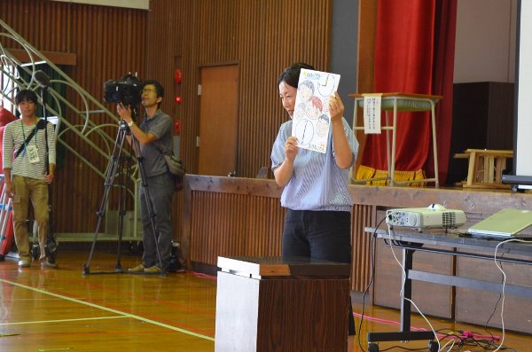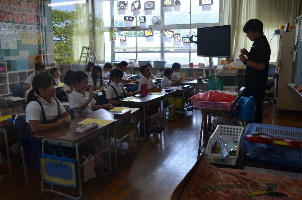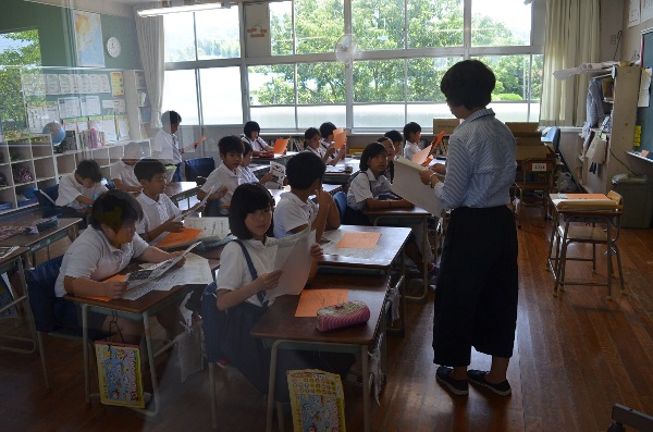 お隣の2年生教室では、担任の全体指導と平行して、佐賀県から来ていただいている復興加配教員の先生が、夏休みの宿題について個別の相談中でした。