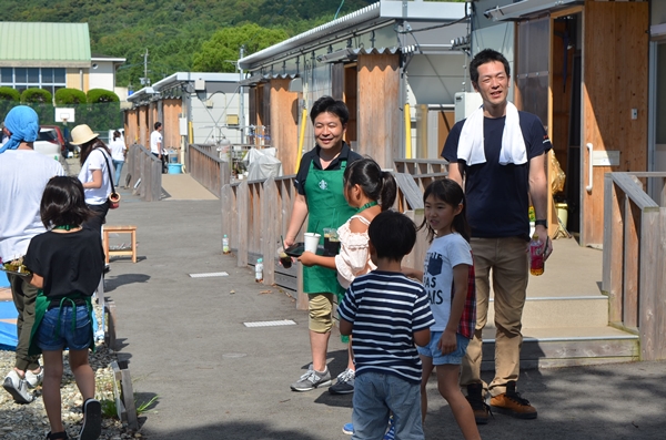 仮設住宅の各戸をまわって、冷たい飲み物のサービス。