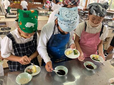 3年生が町たんけんに行ってる間、5年生は今年度2度目の調理実習に取り組んでいました。前回のお茶淹れからパワーアップして今回は「青菜のおひたし」と「ゆでいも」を作りました。包丁で切ったり盛り付けて味付けしたりと、調理の工程は多かったですが班のみんなと協力して無事に作ることができました。