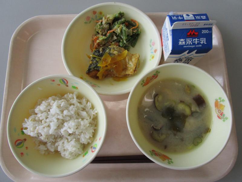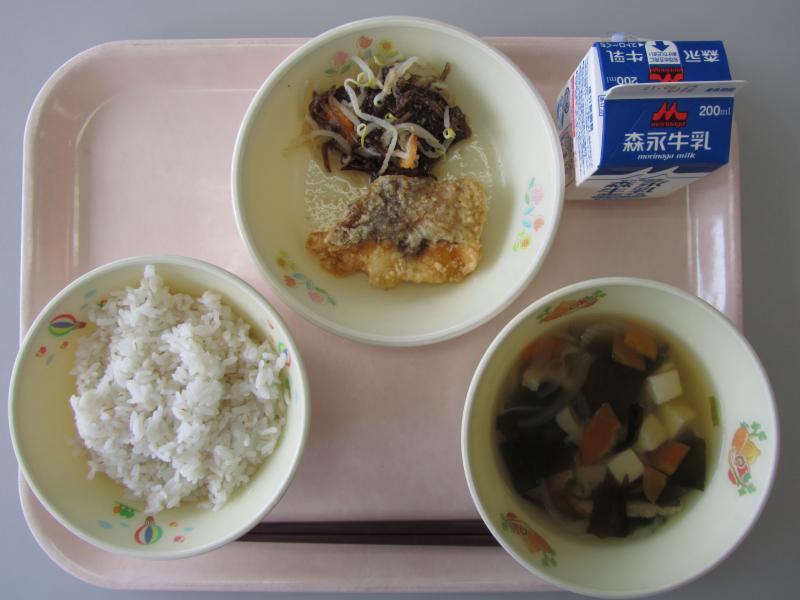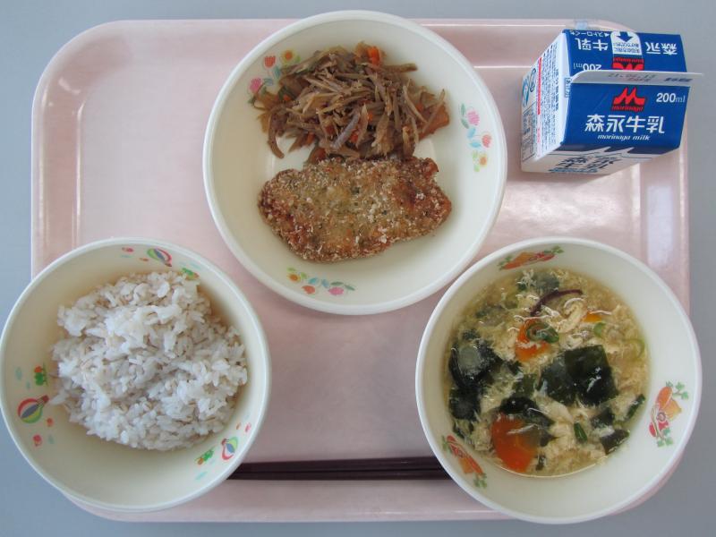 6月2日(水)の給食(麦飯 牛乳 かきたま汁 ホキの天ぷら ごぼうのごまだれ炒め)
