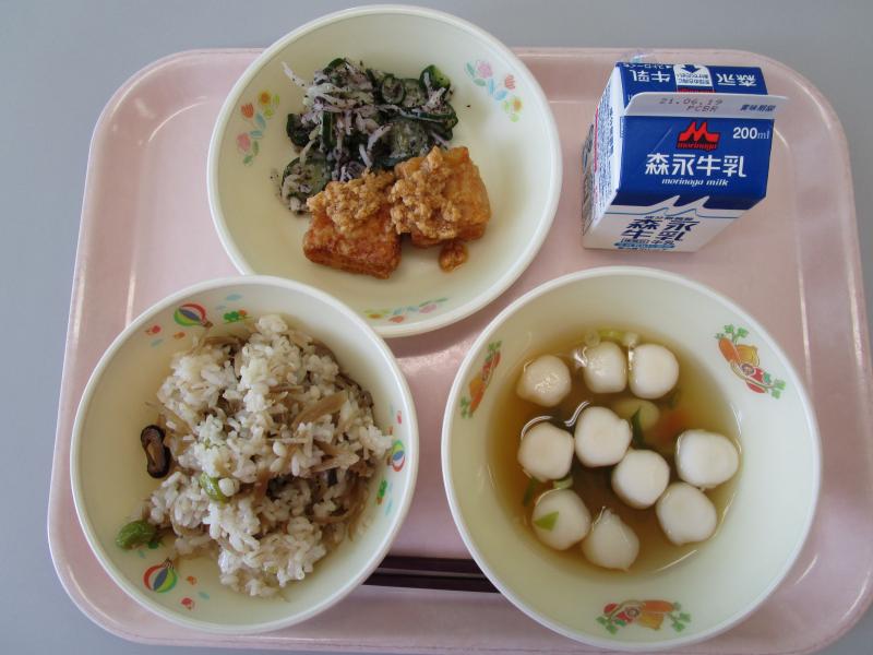 6月8日(火)の給食(ごぼうの混ぜご飯 牛乳 はんぺん汁 揚げ出し豆腐の肉みそあんかけ ゆかりあえ)