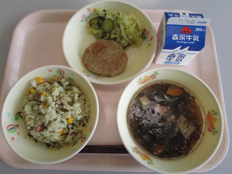 6月15日(火)の給食(高菜チャーハン もずくスープ いわしのハンバーグ サラ玉あえ)