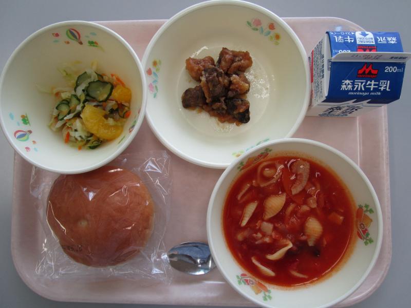 6月17日(木)の給食(米粉パン 牛乳 ミネストローネ レバーのバーベキューソース 甘夏サラダ)