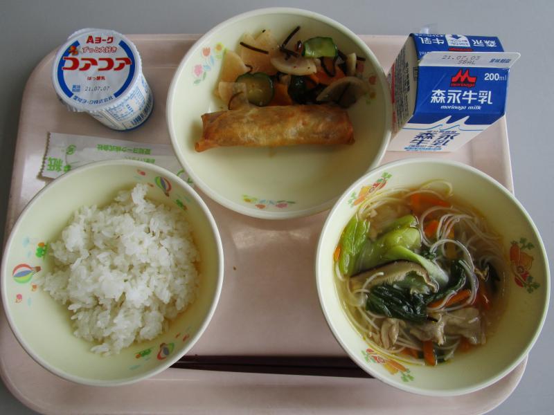 6月22日(火)の給食(麦飯 牛乳 ビーフンスープ 春巻き キムチ和え ヨーグルト)