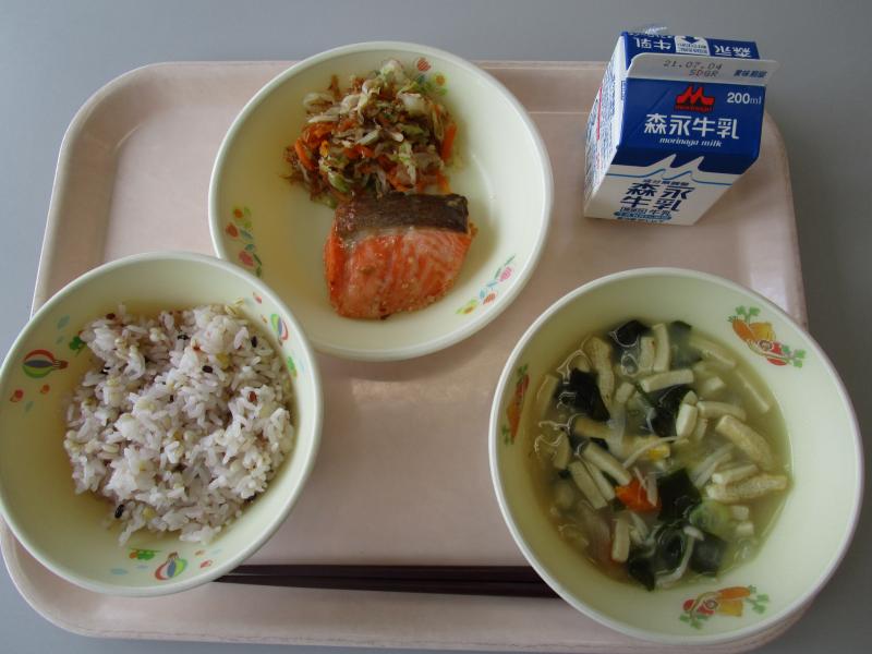 6月23日(水)の給食(雑穀飯 牛乳 鮭の塩こうじ焼き キャベツのおかかあえ 高野豆腐とわかめのみそ汁)