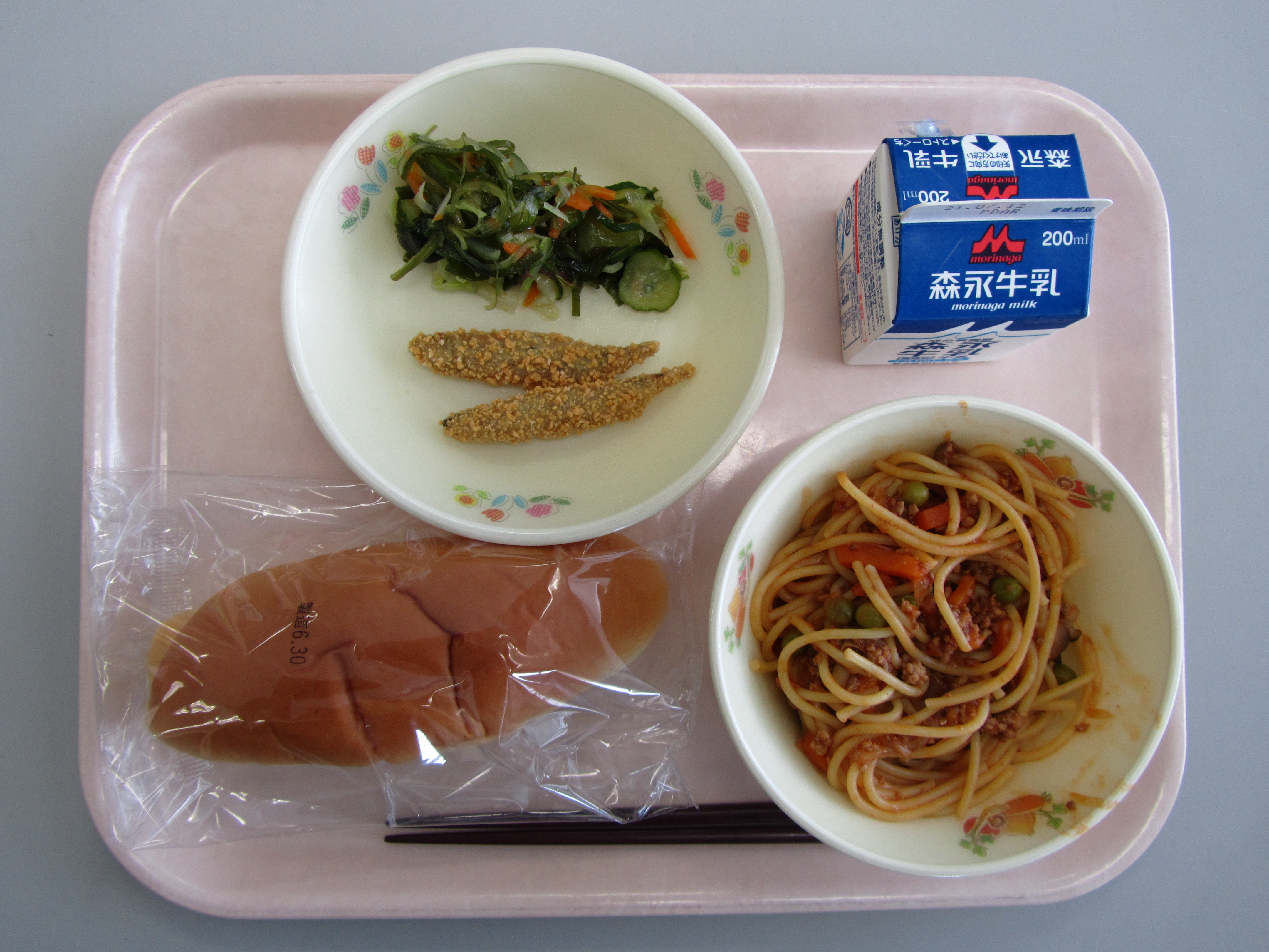 7月1日(木)の給食(ミルクパン 牛乳 スパゲッティミートソース きびなごカリカリあげ 海そうサラダ)