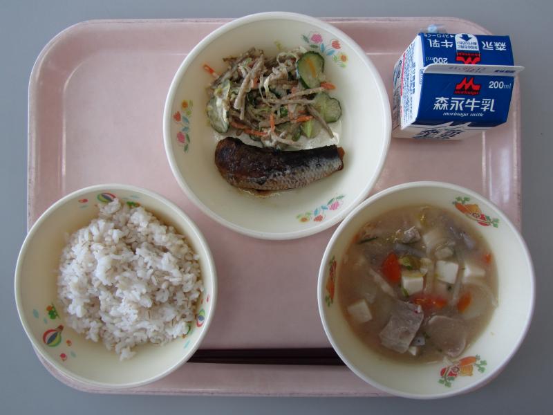 6月1日(火)の給食(麦飯 牛乳 豚汁 大豆の磯煮 ツナの和風あえ)
