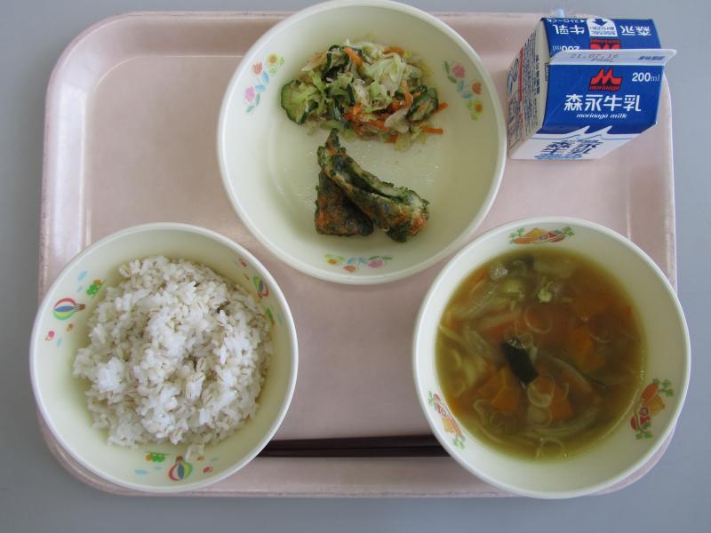 7月5日(月)の給食(麦飯 牛乳 具だくさん汁 竹輪のいそべ揚げ じゃこあえ)