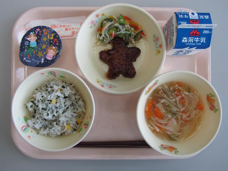 7月7日(水)の給食(とうもろこしご飯 牛乳 にゅうめん 星のハンバーグ カラフルサラダ 七夕ゼリー)
