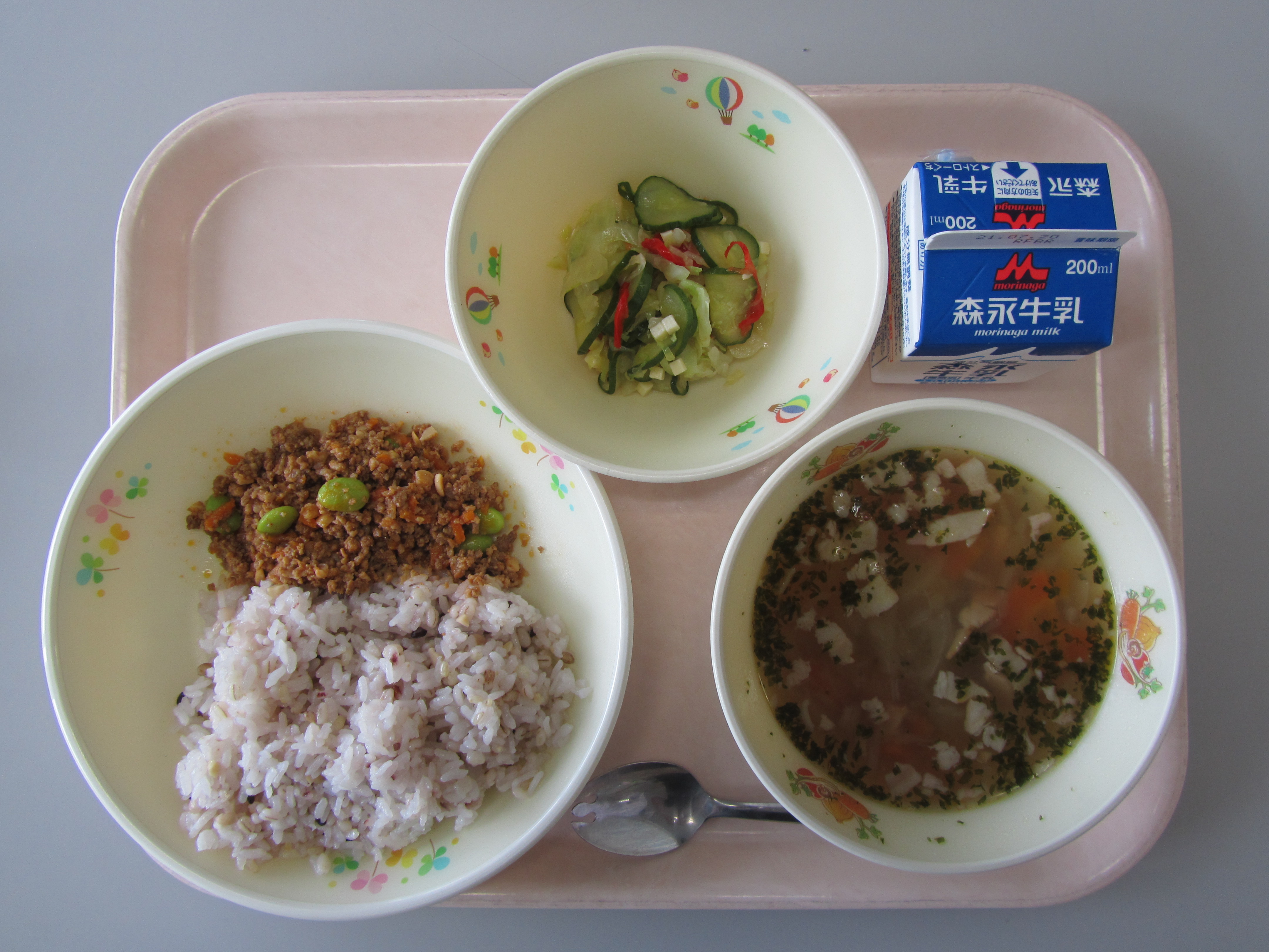 7月9日(金)の給食(タコライス(雑穀ご飯、タコスミート、チーズサラダ) 牛乳 レンズ豆のスープ )